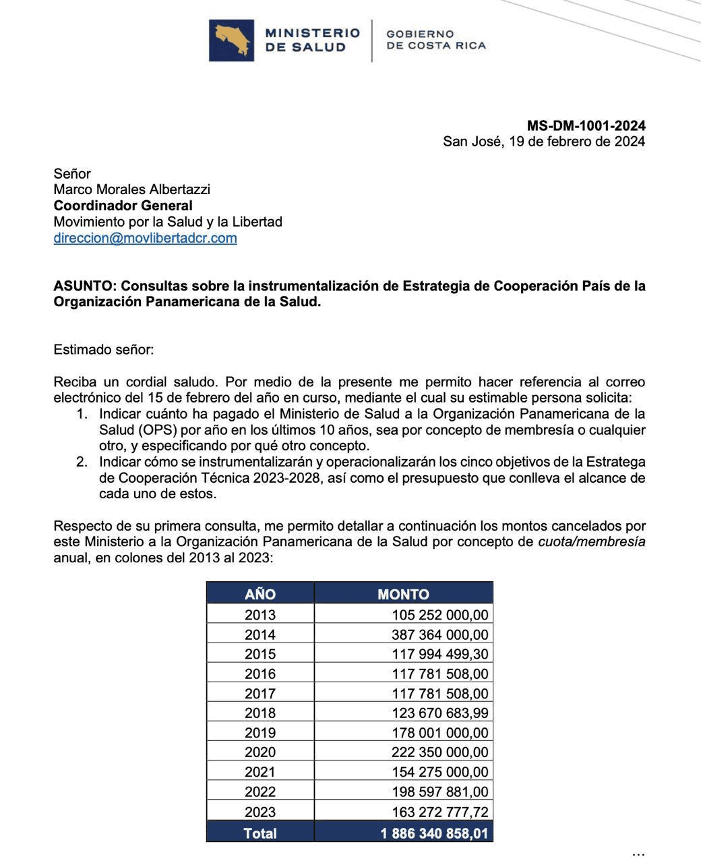 Como pueden ver en el oficio MS-DM-1001-2024 del 19 de febrero del 2024, desde el 2013 hasta el 2023 (11años), Costa Rica pagó tan sólo por concepto de membresía a la Organización Panamericana de la Salud (OPS) –no se contempla lo pagado por la correspondiente membresía a la OMS que se paga por aparte–, un total de ₡1.886.340.858,01.