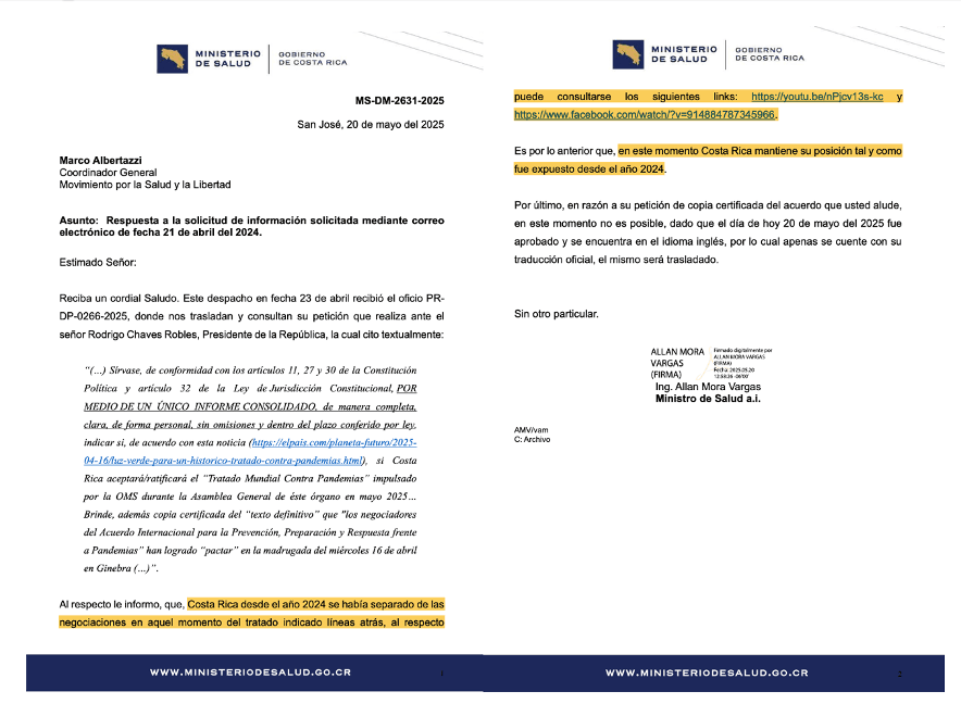 Ante las implicaciones de este Tratado Pandémico para nuestra nación, he planteado múltiples consultas a la Presidencia, al Ministerio de Salud y al Ministerio de Relaciones Exteriores y Culto [y sí, también muchos recursos de amparo porque no han querido contestar. De hecho, el 21 de abril hice una consulta sobre este tema y siendo que no contestaron, tuve que recurrir al Tribunal Constitucional por medio de un Recurso de Amparo (Expediente No. 25-013084-0007-CO) para hacer valer nuestros derechos de acceso a la información]. En fin, hoy [de forma misteriosa y repentina] han contestado indicando que desde el año pasado se decidió retirar al país de la negociación del Tratado Pandémico y que esa decisión se mantiene, por lo cual, pareciera que Costa Rica no ha aceptado el Tratado Pandémico.