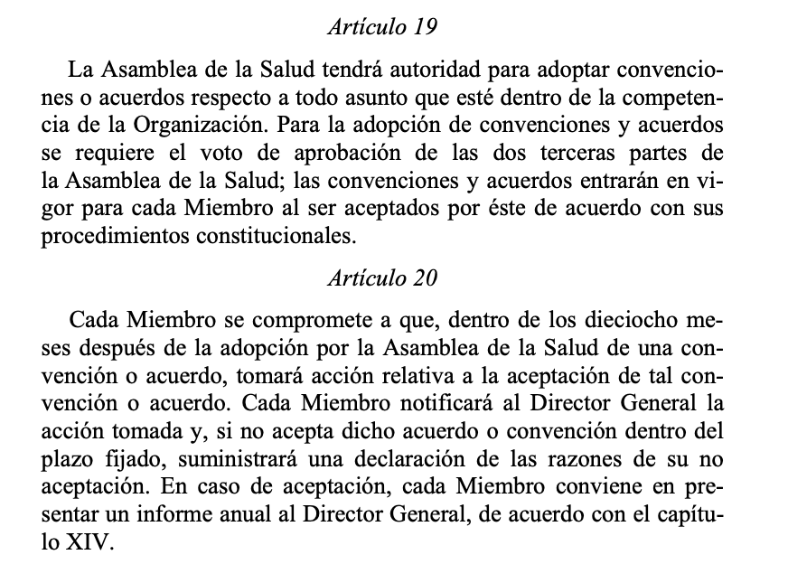 No obstante, una mayoría de países han aceptado y promovido estos dos instrumentos, lo que de acuerdo con el Artículo 19 de la Constitución de la OMS quiere decir que siendo que dos terceras (2/3) partes de la Asamblea han votado de forma positiva, se adoptará el acuerdo o resolución. Por su parte, el artículo 20 indica que al haberse adoptado cada Estado deberá ratificar e implementar el acuerdo tomado, salvo que en un determinado plazo no rechace o haga reservas al acuerdo aceptado en la AMS.