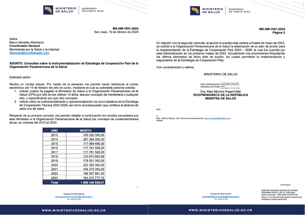 Tomando en consideración los gravísimos errores, los amplísimos conflictos de interés que tanto la OMS como la OPS tienen, así como las enormes cantidades de dinero que nos cuesta ser parte de la OPS (al momento de escribir este documento, no hay datos disponibles sobre si hay alguna cuota que se pague anualmente a la OMS), como se puede ver en el oficio MS-DM-1001-2024, que indica que ser parte de esta organización nos ha costado (económicamente, no hablemos del costo humano, el costo a la salud y el costo a los derechos humanos y libertades individuales, ni los costos asociados al cumplimiento de órdenes de compra de fármacos que la OPS nos vende por medio del Fondo Rotatorio) a los costarricenses, en un plazo de 10 años (2013-2023) la suma de ₡1.886.340.858, 01 (es decir, unos US$3.725.563,20). Creo que en un análisis de Costo-Beneficio de ser parte de estas dos organizaciones, el resultado es 100% Costo – 0% Beneficio, con lo cual yo diría que ese dinero (y el que seguimos pagando), sería mejor utilizado en verdaderos programas de salud enfocados a mejorar la calidad nutricional de los costarricenses, a iniciar programas deportivos y de acondicionamiento físico y enseñar a los costarricenses a cuidar de forma integral su salud. Para eso no necesitamos a una OPS o a una OMS, metiendo sus narices en las políticas públicas de salud de nuestro país.